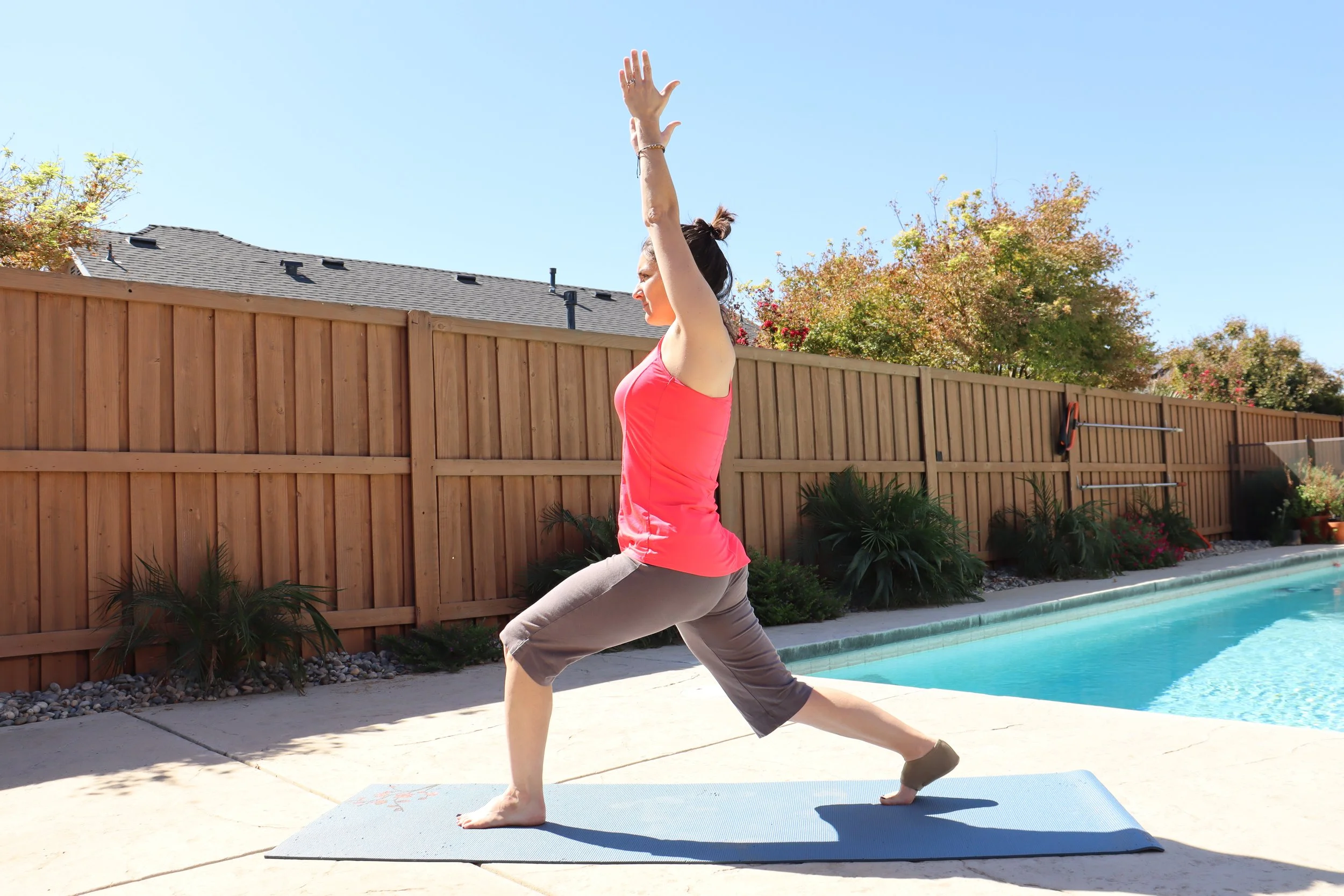There are several variations in this pose that allow you to challenge your balance. You can practice this pose with a hand on a wall or chair, you can keep both hands on your hips instead of raising them by your ears, or you can twist toward the side with the forward, bent leg.